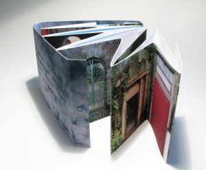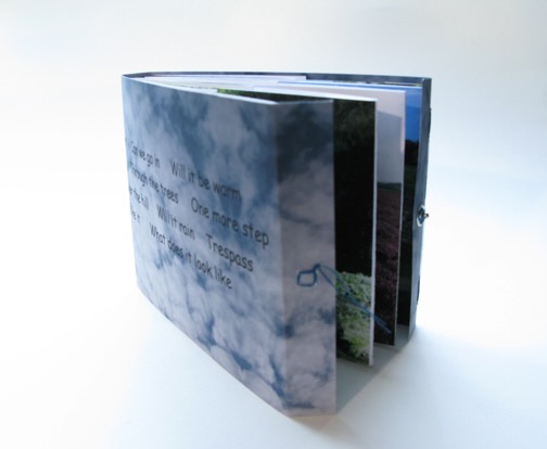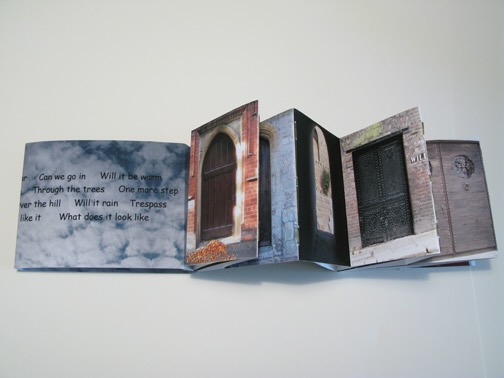 I made this book for The Sheffield Artist’s Book Prize at Bank Street Arts, Sheffield 2009. The book is made up of photos of Doors on one side and paths from walks on the other side, the cover is a sky back round with words.